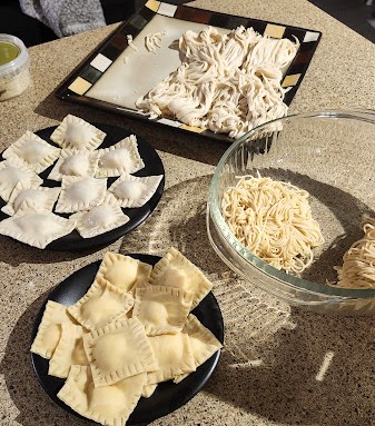 Let the dough rest for no more than four hours in the fridge. When you’re ready take it out and use the machine to flatten the dough to make ravioli or cut it into smaller pieces for spaghetti.